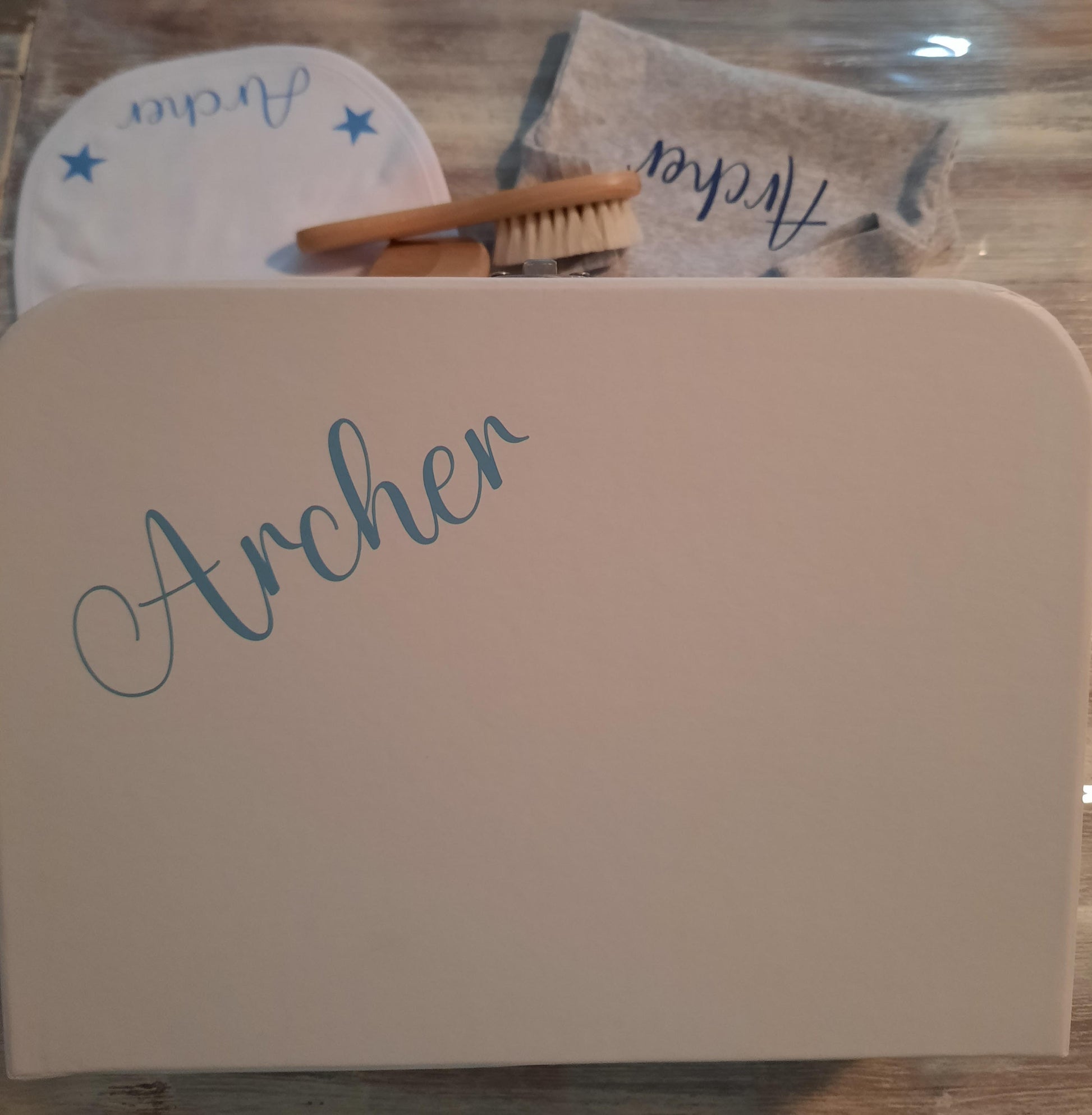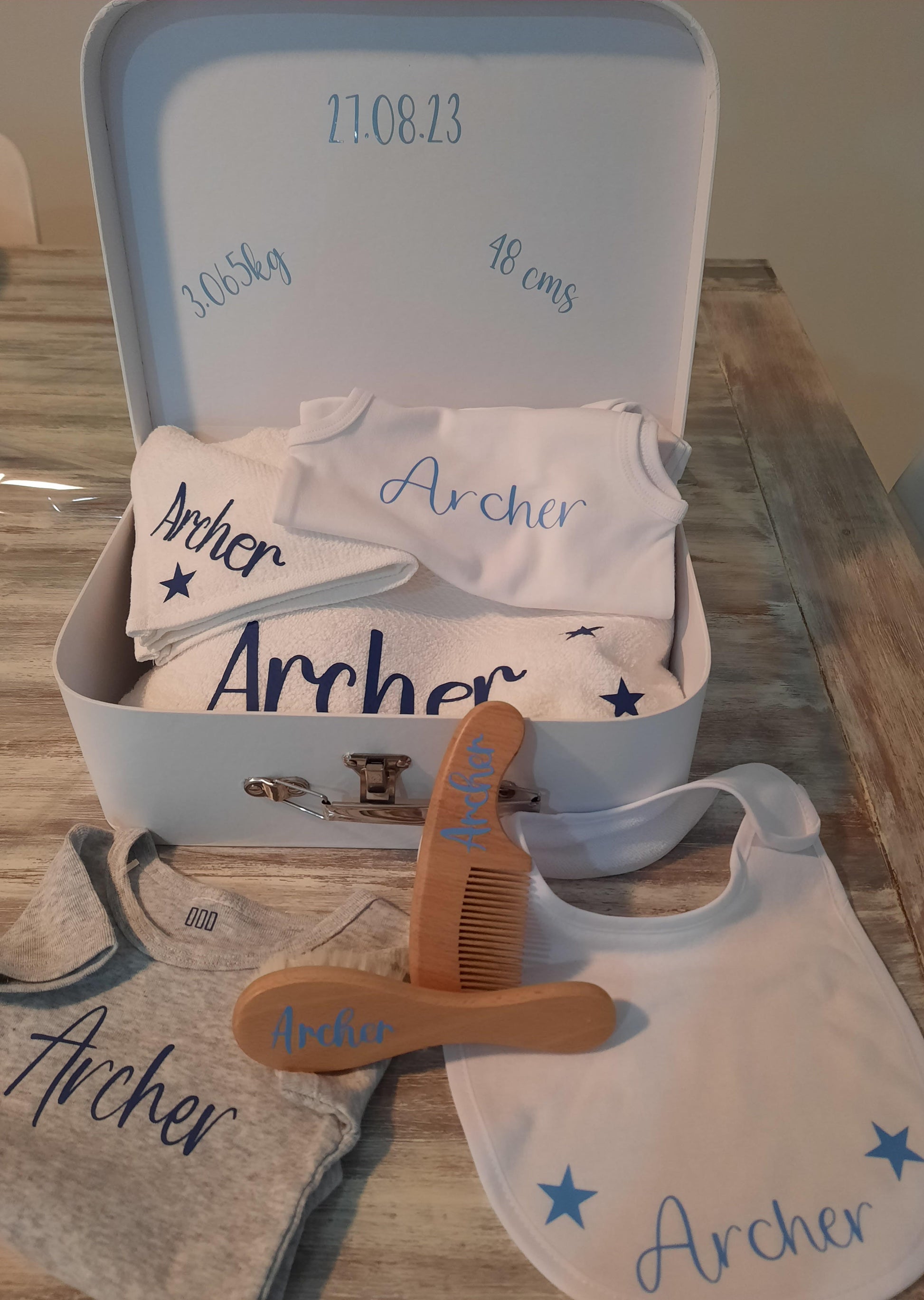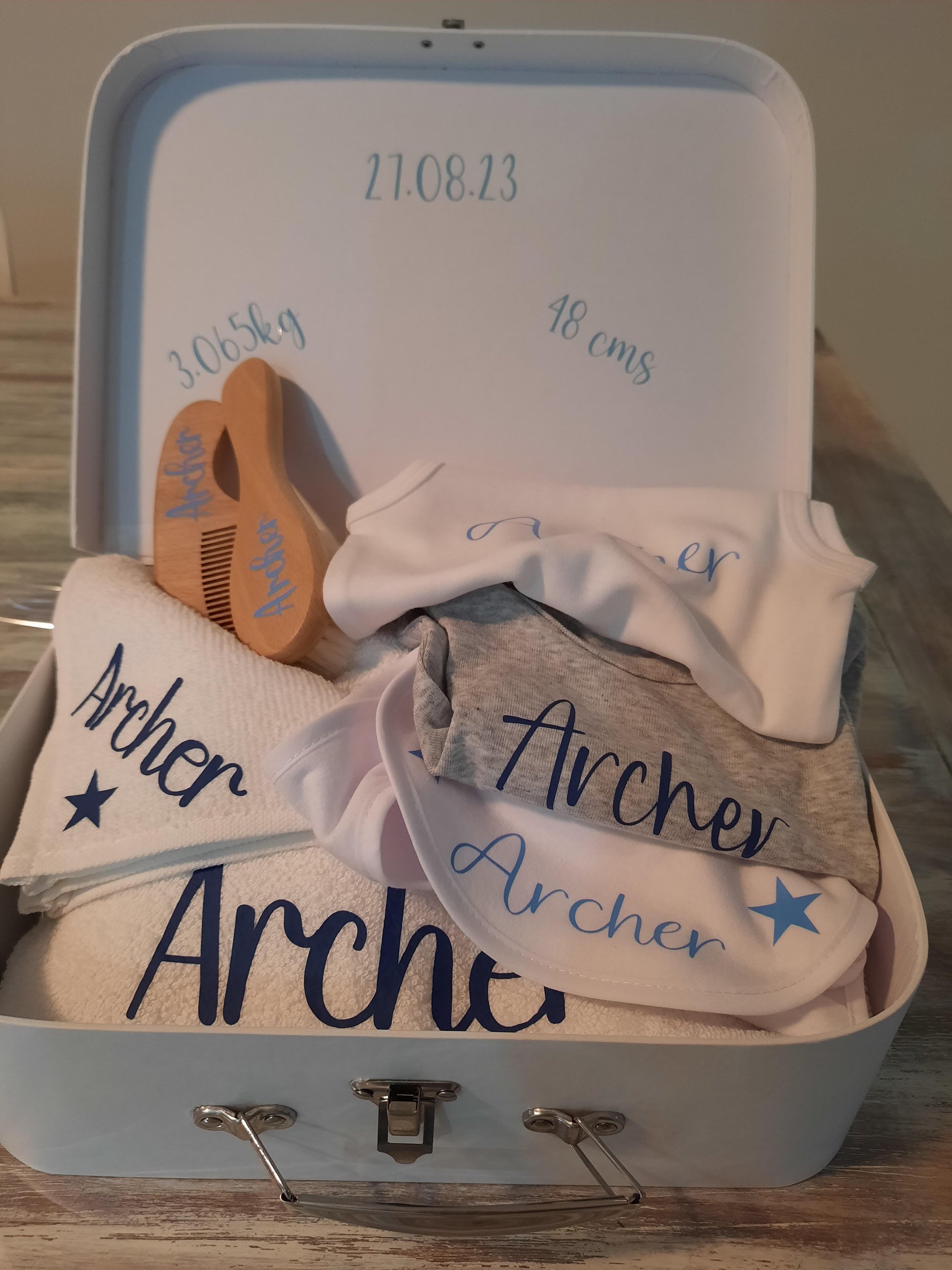 The gift box, suitcase style, can also be personalised with all baby's details, a lovely keepsake they have forever.