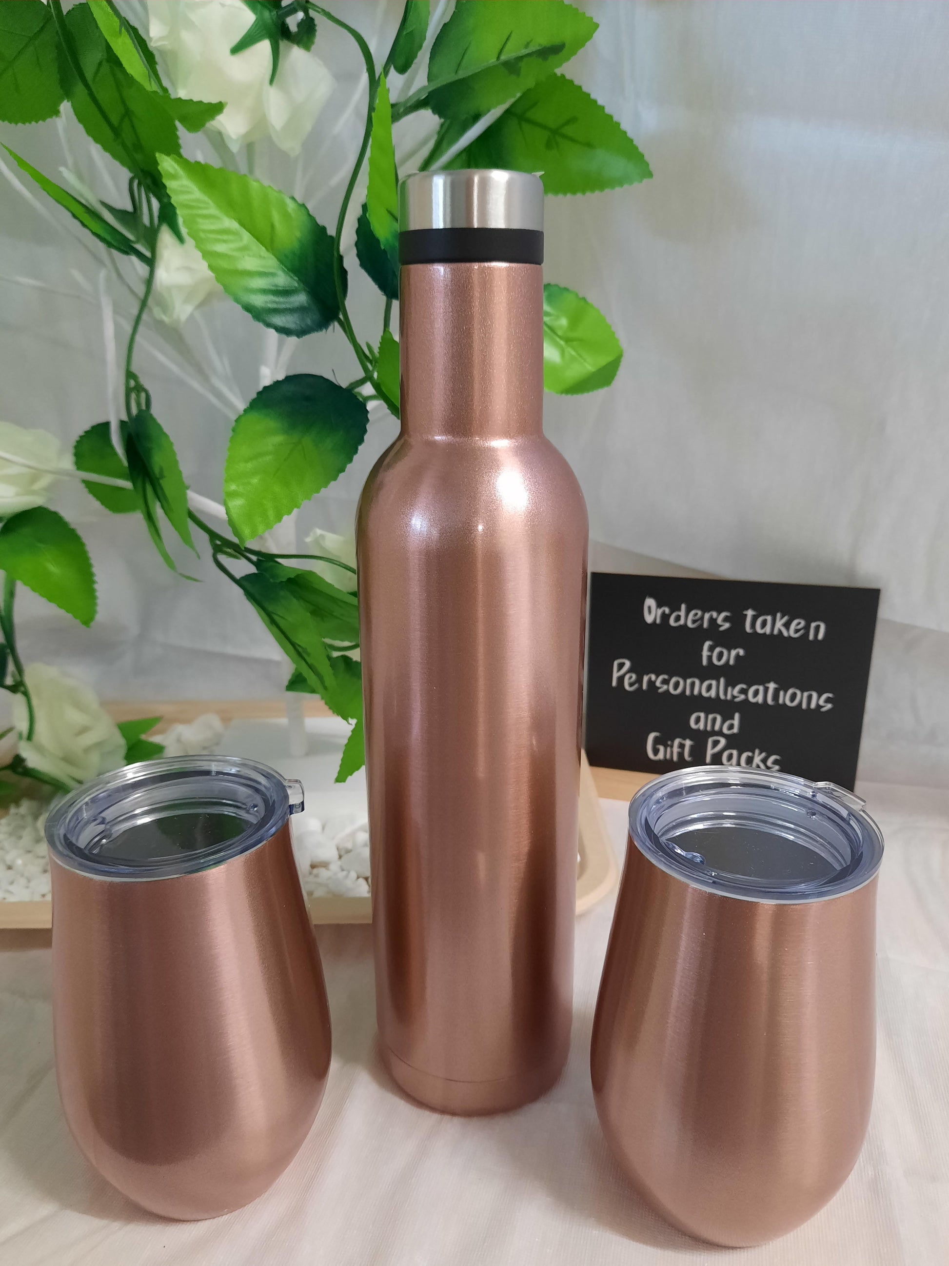 Rose gold colour drink bottle with two cup sets. Can be designed as per the picture for Christmas, with names on cups.